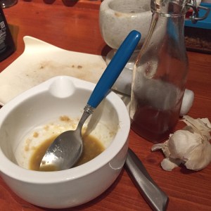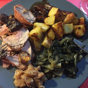 Prunes also evoke early mornings when, so very occasionally the second person up, I’d happen upon my dad relishing them, plump-soaked overnight from their wizened catatonia, We’ll eat our pork with apple chutney that I made from this summer’s glut out in N. Lazio, with roast potatoes (of course), and bieti (I love that gently, almost mustardy/irony flavour) courtesy of Silvia, our go-to woman for fruit and veg at the market. Her high esteem for Bruce is a delight to them both, and creates conversational eddies into which food ideas drift. We’ll follow this all up with Silvia’s puntarelle, for which I made the sauce earlier, a riff on the recipe by one of the first friends I made in Testaccio, Rachel Roddy.